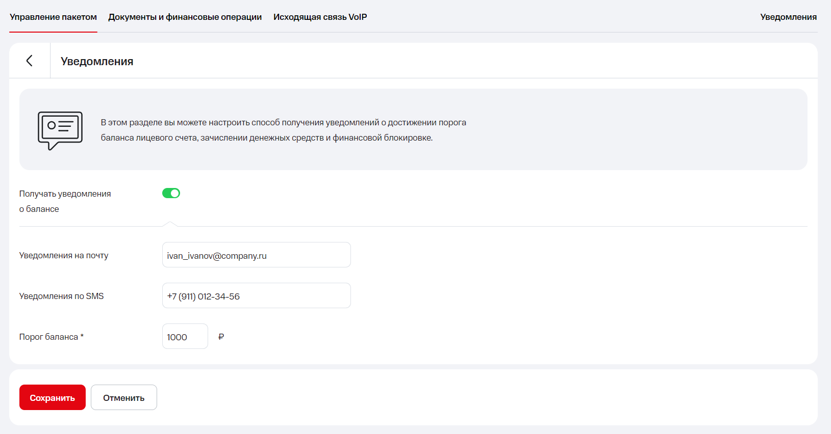 При необходимости можно изменить телефон и e-mail получателя уведомлений или установить другой порог баланса. Для этого: