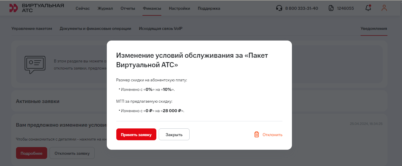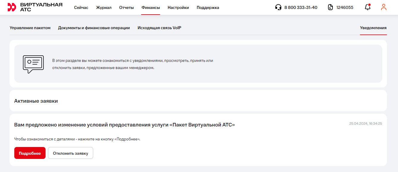 1. В этом случае вы увидите заявку на скидку в разделе «Уведомления» своей Виртуальной АТС. Чтобы узнать больше о предоставляемой скидке, кликнете на кнопку «Подробнее».
