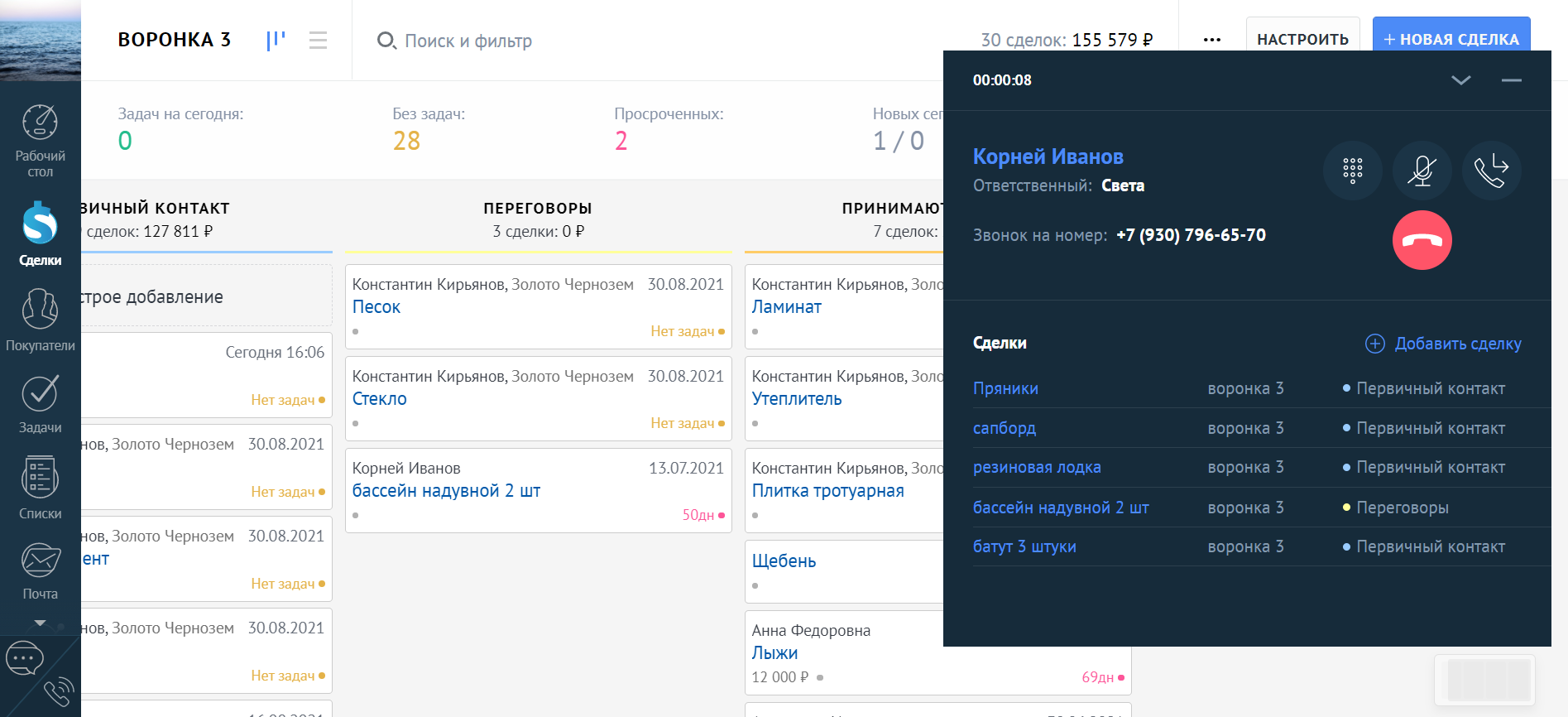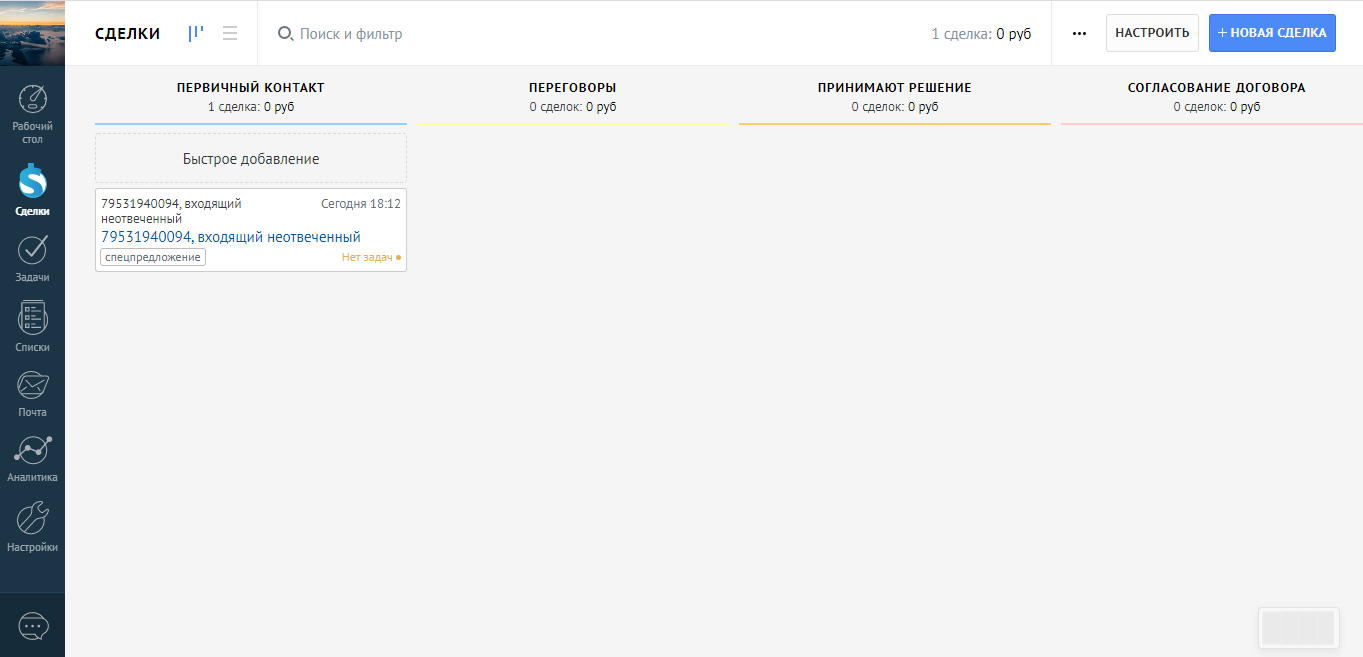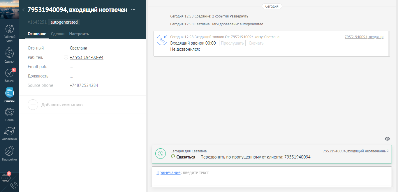Одно из главных правил успешного бизнеса – фиксировать каждый звонок и каждого позвонившего. Даже если ваш менеджер не успел или забыл создать контакт или сделку, вы все равно не упустите этого клиента. Необходимая информация о контакте и сделке сохранится в amoCRM автоматически, менеджер в любой момент может вернуться к ней и продолжить работу с клиентом.