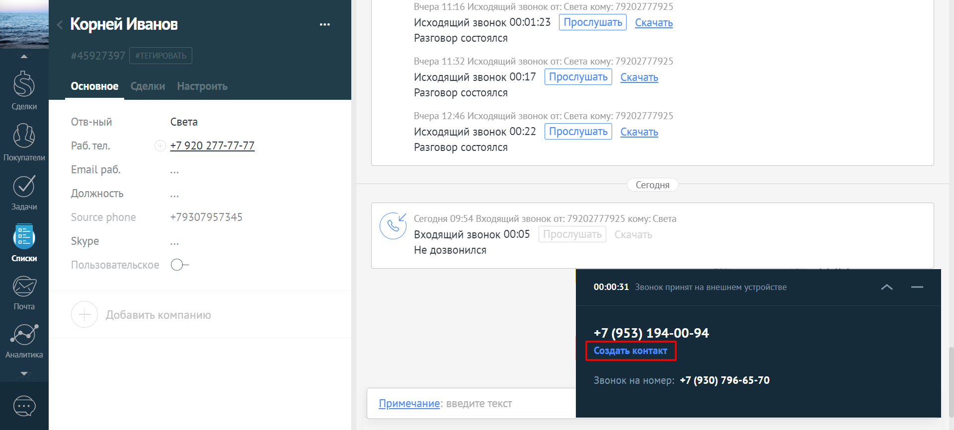 Если номер еще не был занесен в базу клиентов, вы можете сразу создать контакт.