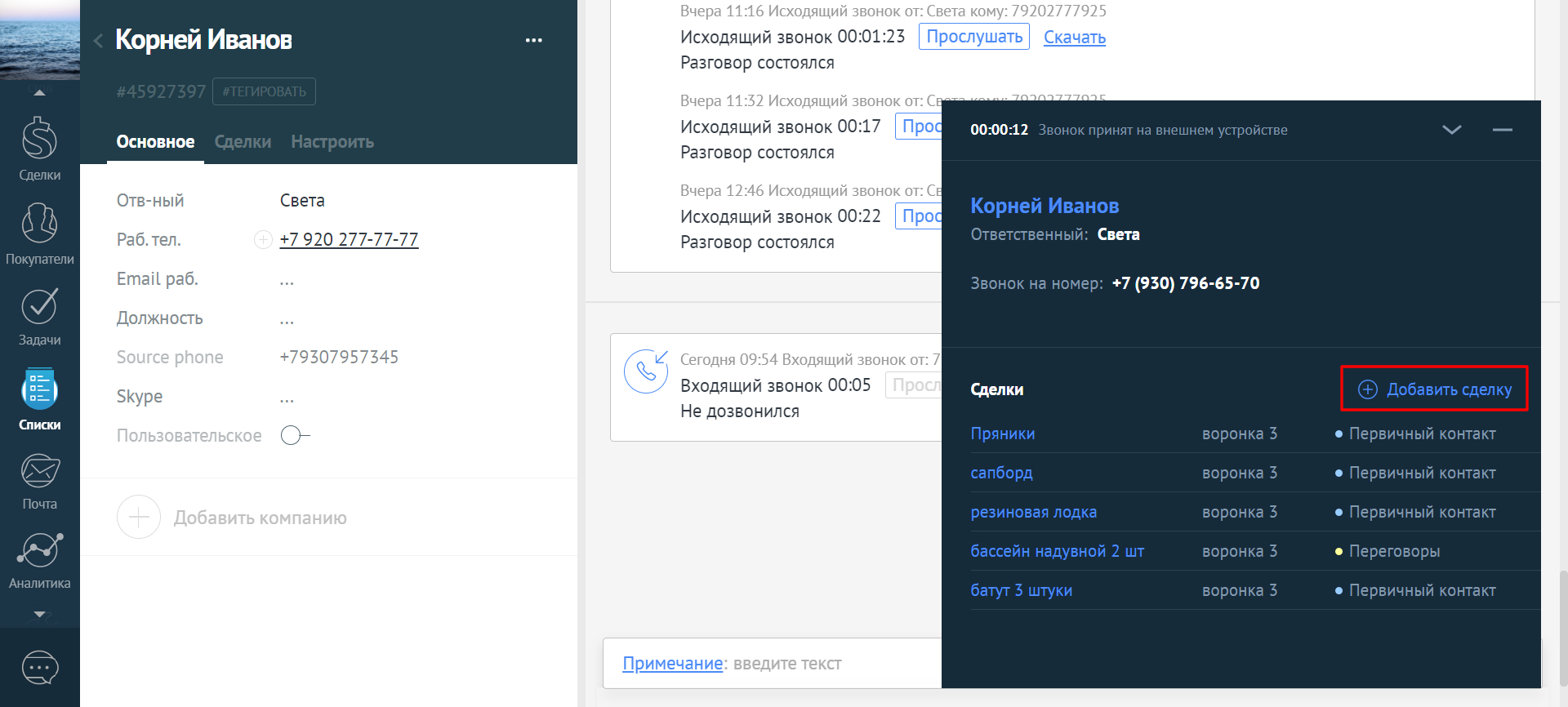Виджет покажет менеджеру всю историю работы с клиентом, даст возможность быстро перейти в карточку клиента или нужную сделку с ним, а также позволит создать новую сделку прямо во время разговора.
