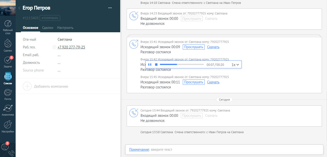 АТС передает в amoCRM все звонки. Их записи можно прослушать в любое время. Это позволит вам контролировать качество обслуживания клиентов, а менеджеры будут вести себя более вежливо и профессионально, зная, что их разговоры записываются.