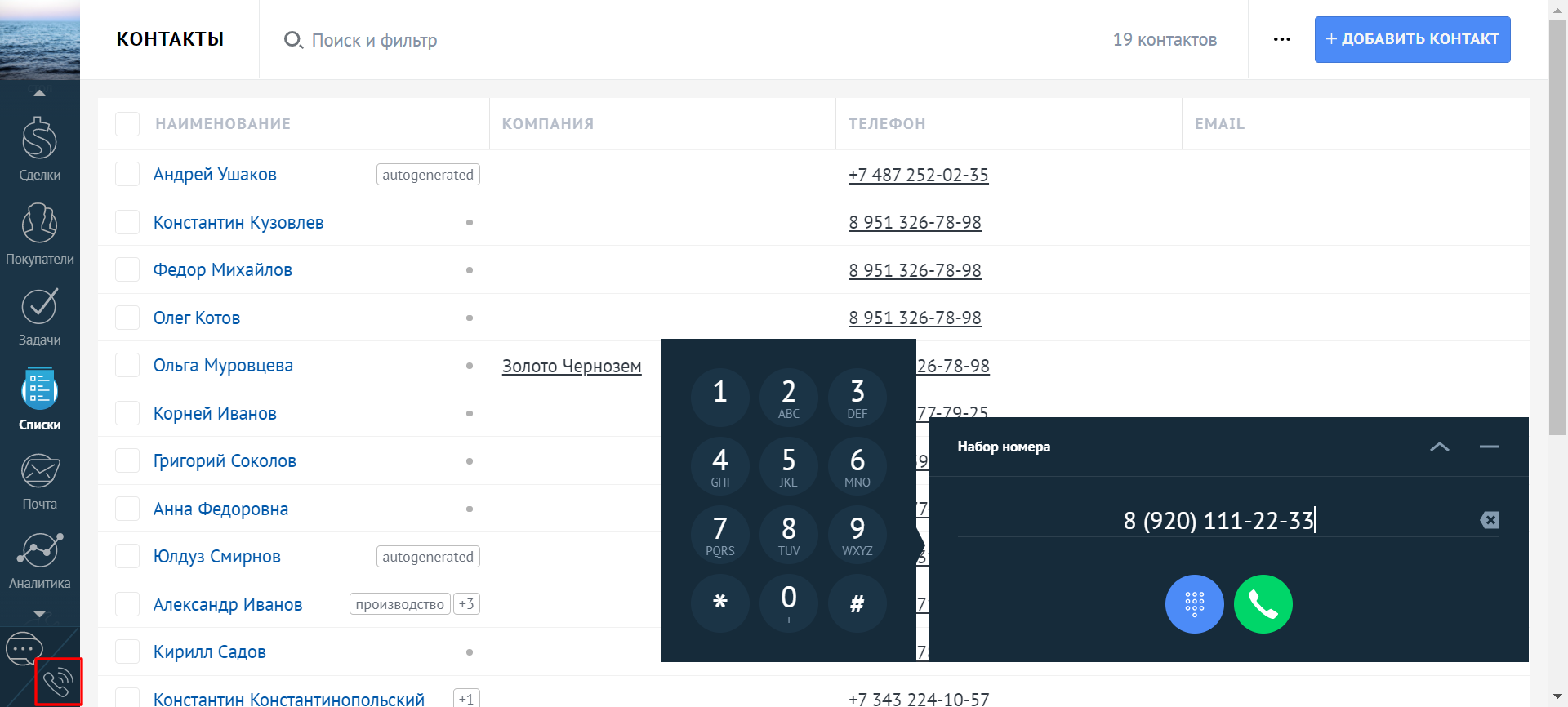 Также номер телефона можно набрать вручную в виджете (при подключенном WebRTC). Для этого откройте виджет кликом по телефонной трубке в левом нижнем углу экрана и наберите нужный номер (на клавиатуре или с помощью кнопок в виджете).