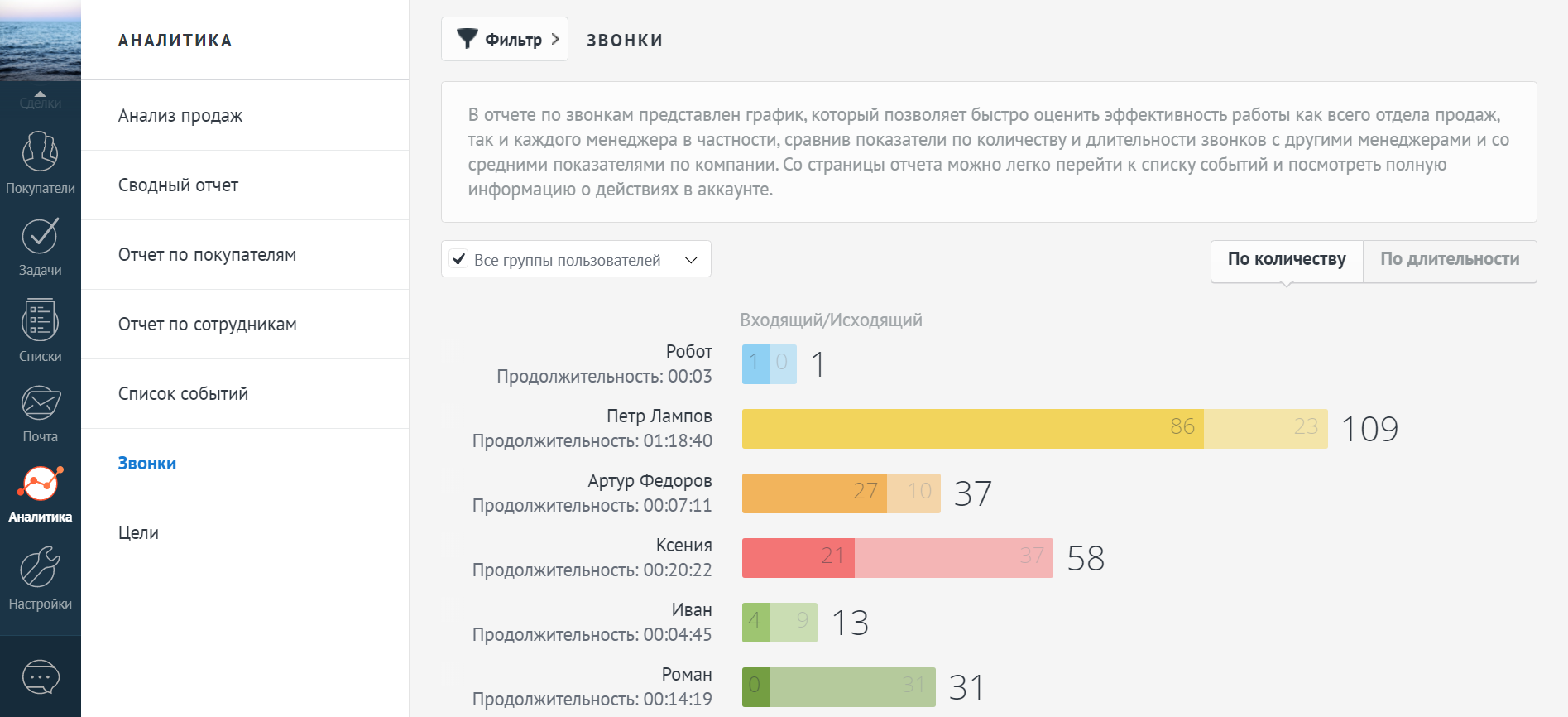 В разделе «Аналитика» вашей amoCRM вы можете увидеть историю звонков всего отдела продаж и каждого менеджера в отдельности, сравнить показатели по количеству и длительности звонков с другими менеджерами и со средними показателями по компании.