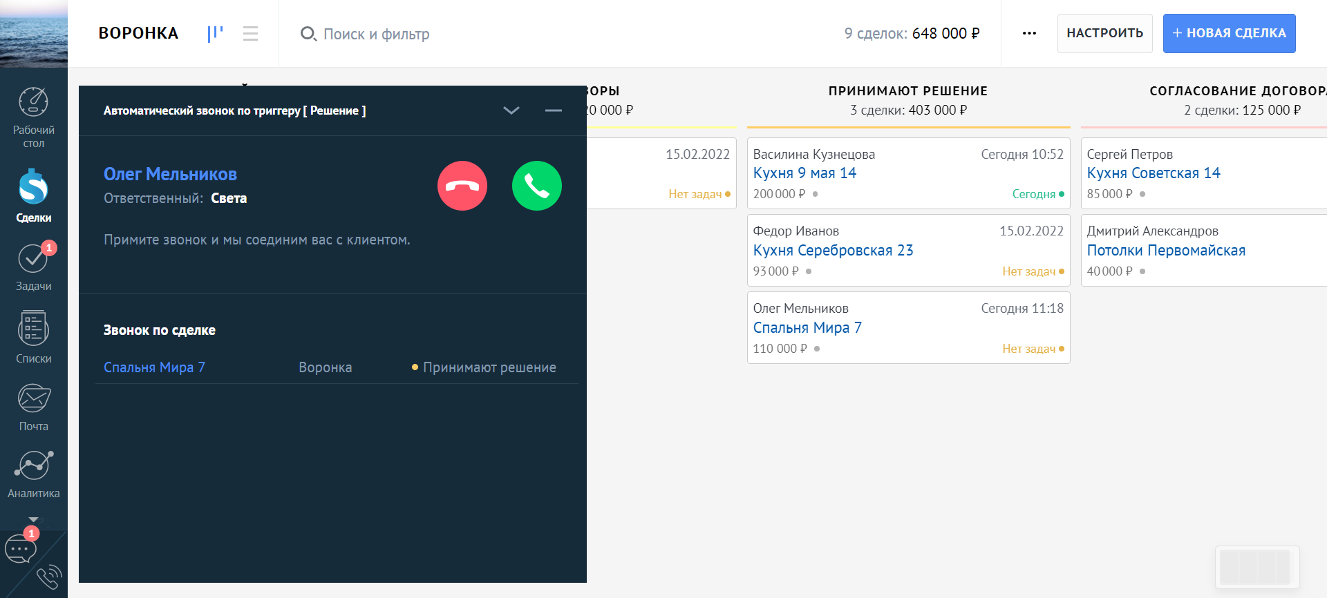 2. По наступлении триггерного события Виртуальная АТС автоматически позвонит менеджеру, сообщит ему о звонке из диджитал-воронки, назовет имя воронки и откроет нужную сделку в amoCRM.