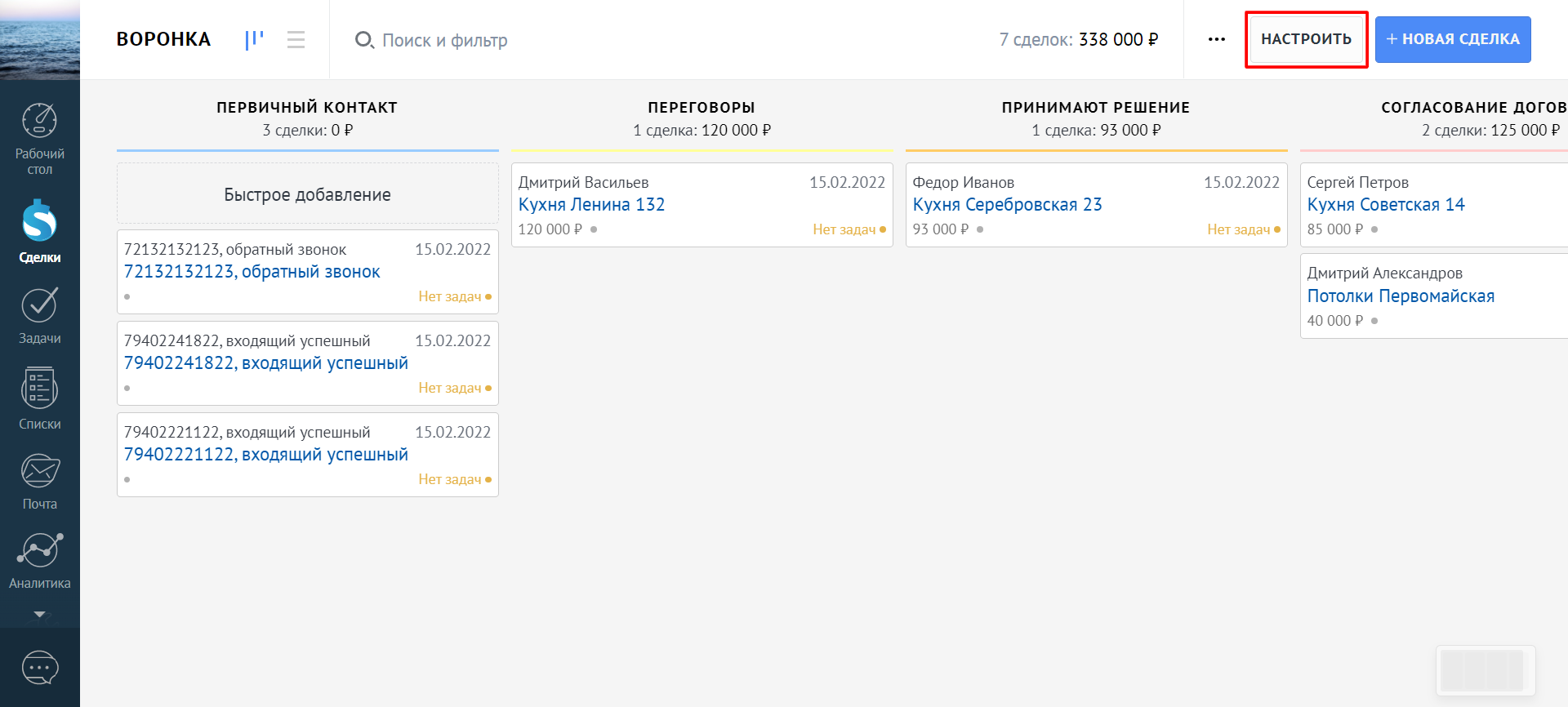 1. В интерфейсе amoCRM зайдите в раздел «Сделки». В правом верхнем углу нажмите «Настроить».