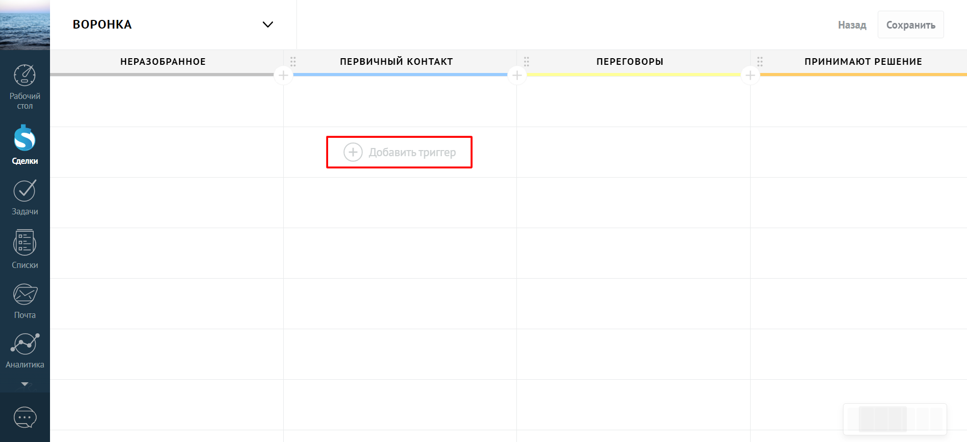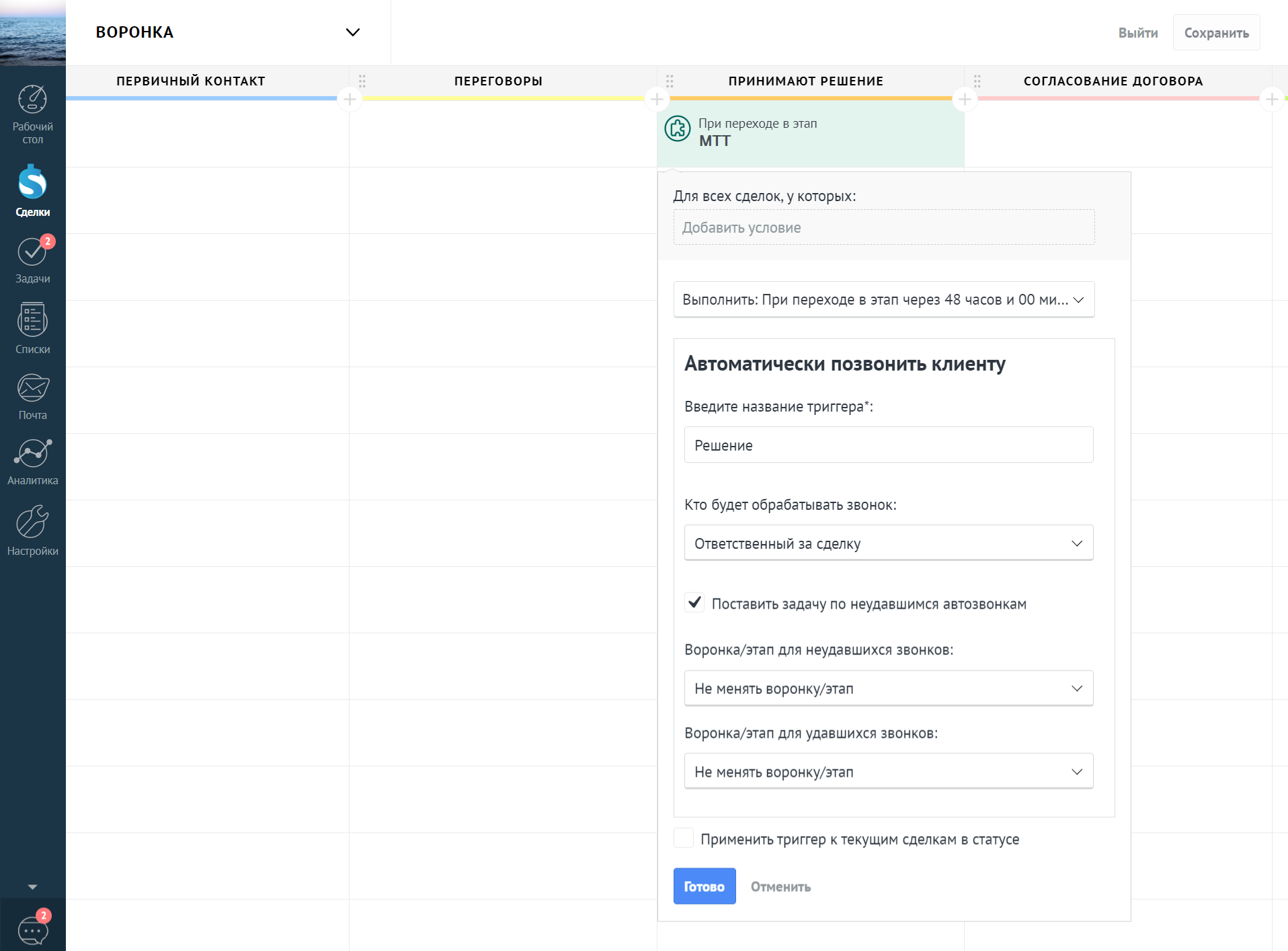 - какие изменения в сделке должны активировать работу триггера (например, переход в этап);