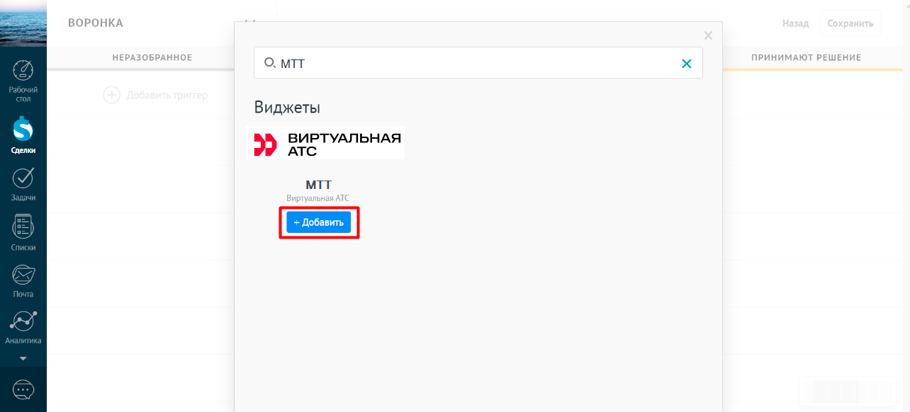3. Выберите виджет Виртуальной АТС (для удобства воспользуйтесь поиском). Нажмите «Добавить».