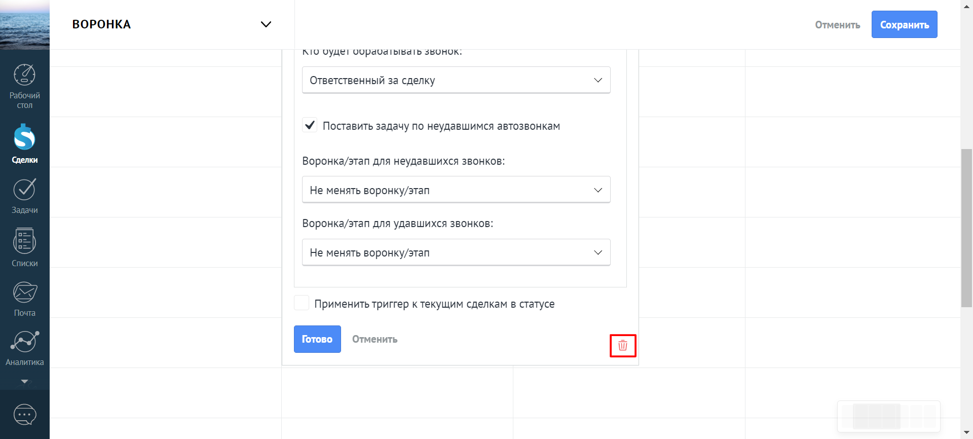7. Если вы захотите, чтобы Виртуальная АТС перестала совершать автоматические звонки, просто удалите неактуальный триггер. Для этого в настройках воронки выберите нужный триггер и нажмите на корзину в правом нижнем углу окна настройки.