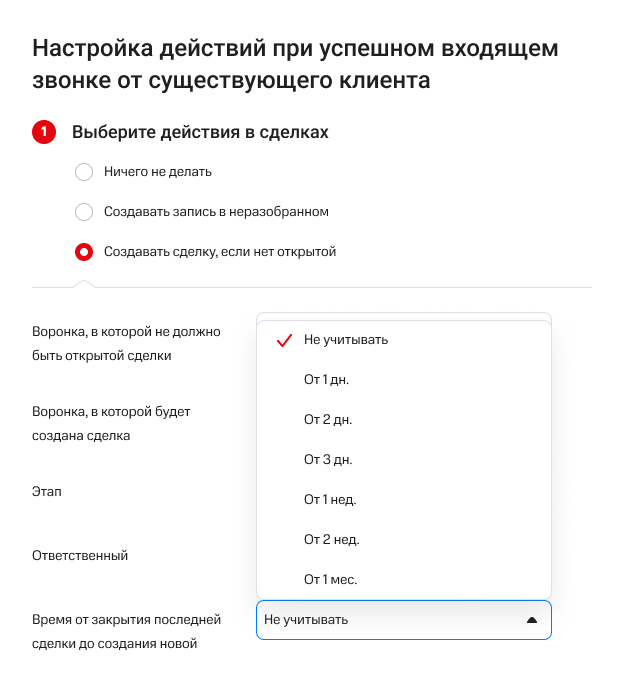 Чтобы не удалять дубли вручную, настройте период ожидания после закрытия сделки — если в это время позвонит тот же клиент, то дубль не появится в CRM.