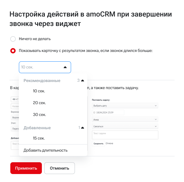 В открывшемся окне вы можете настроить появление карточки с результатами звонка — выберите, при какой длительности вызовов эту карточку показывать.