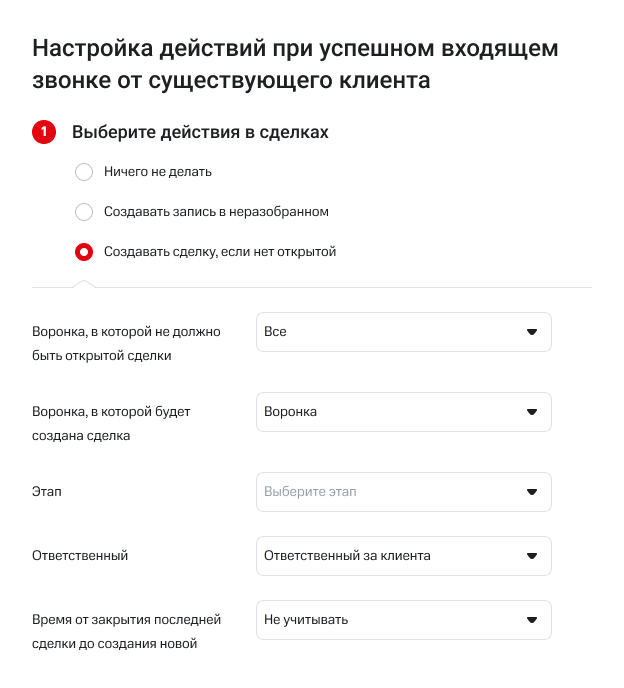 - Воронки, в которых АТС будет проверять наличие открытых сделок по позвонившему клиенту, чтобы исключить дубли.