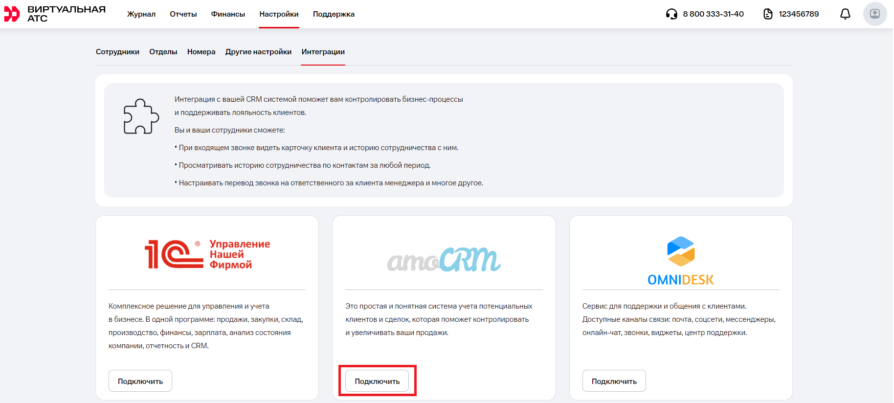 Настроить интеграцию могут только пользователи с правами администратора в обеих системах.1. В вашей Виртуальной АТС зайдите в меню «Интеграция с CRM». Найдите виджет amoCRM и кликните на него.
