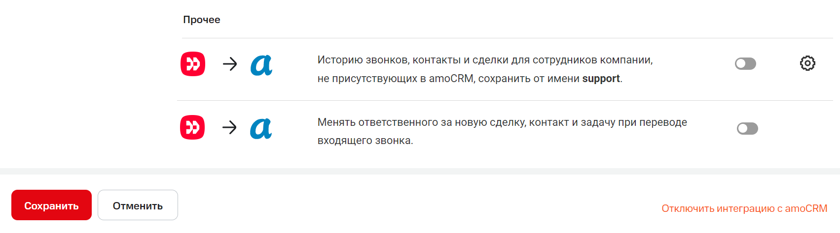 - история звонков ваших сотрудников, не присутствующих в amoCRM, будет сохранена от имени выбранного пользователя. Этой опцией можно пользоваться, если вы не сопоставили всех менеджеров или если у вас есть сотрудники, которые не работают в amoCRM, но могут звонить клиентам. Например, курьеру не обязательно работать в amoCRM, но при этом он участвует в процессе совершения сделки и может звонить клиенту. Чтобы вы могли контролировать и этот этап работы, выберите сотрудника, от имени которого в amoCRM будет сохраняться история и запись таких звонков.