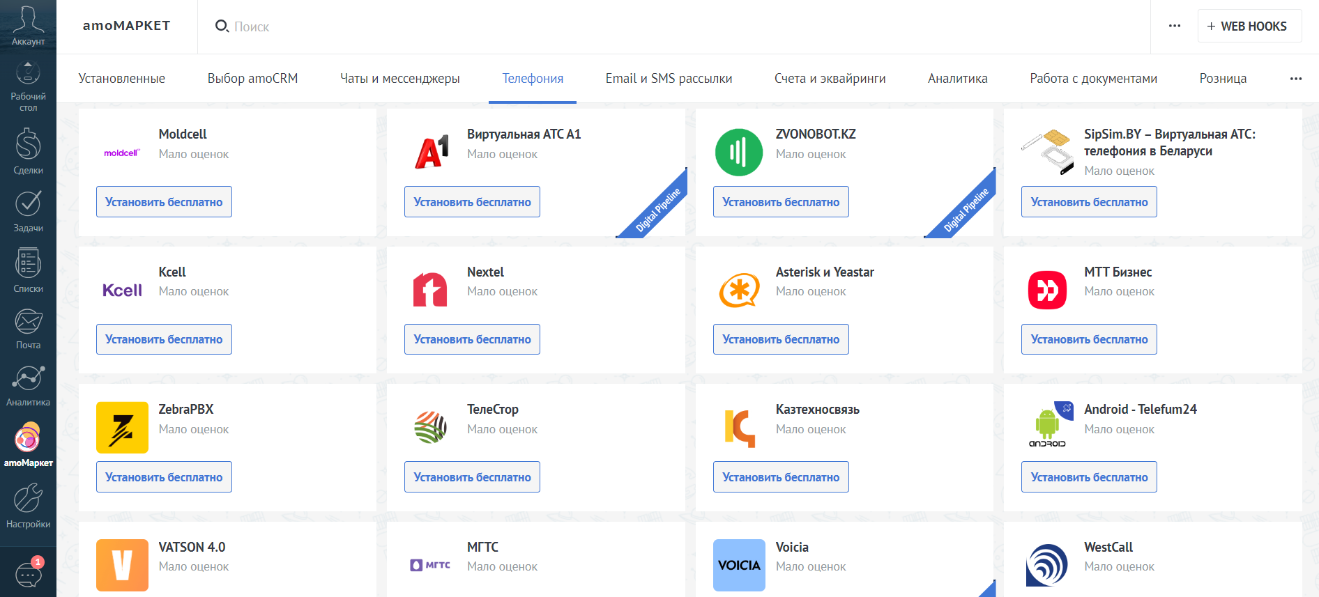 2. В интерфейсе вашей amoCRM перейдите в amoМаркет, далее – «Телефония». В списке доступных интеграций найдите виджет нужного вам оператора либо введите название оператора в поле поиска. Нажмите «Установить бесплатно».