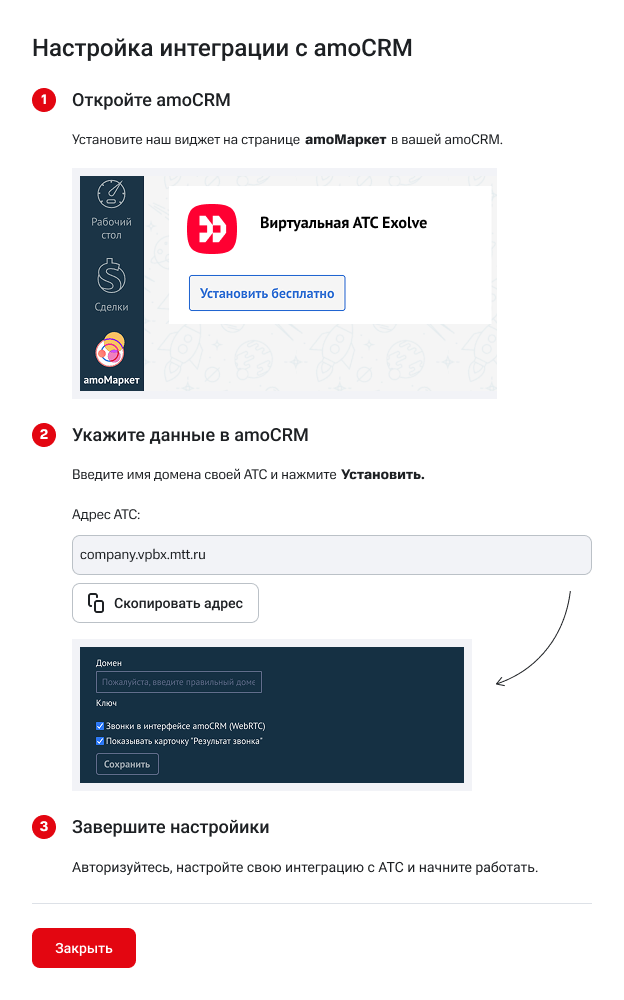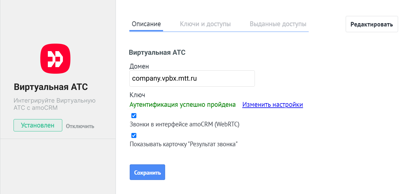 3. В открывшемся окне вставьте адрес вашей Виртуальной АТС. Если вы хотите делать звонки прямо в интерфейсе amoCRM, попробуйте функционал WebRTC (поставьте галочку). Нажмите «Сохранить».