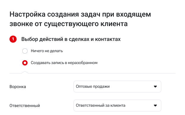 В настройках записей в неразобранном вы можете выбрать воронку и ответственного: сотрудника, принявшего звонок или ответственного за клиента.