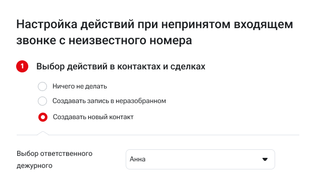 При входящих звонках с неизвестного номера в amoCRM могут автоматически создаваться контакты. Чтобы отрабатывать пропущенные звонки с неизвестных номеров, в настройках сценария интеграции также можно выбрать дежурного, ответственного за перезвон по этим номерам.