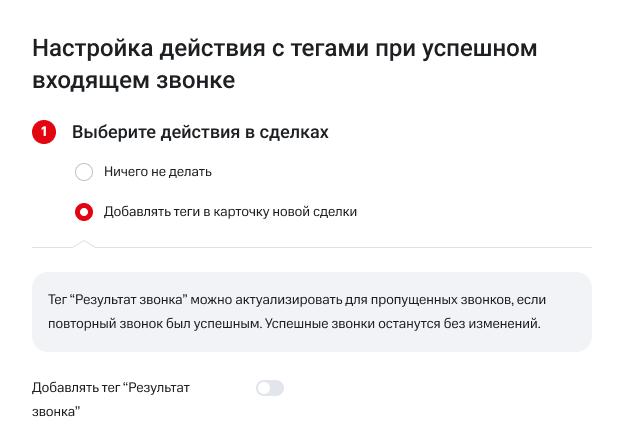 2. В открывшемся окне выберите, что делать при успешном входящем звонке: добавлять теги в сделки или контакты или не добавлять.