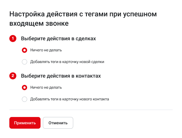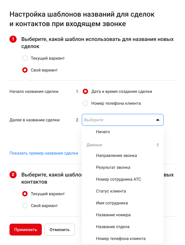 3. В меню ниже выберите, с чего будет начинаться название сделки при входящем звонке: дата и время создания сделки или номер телефона клиента. По этим параметрам проще всего отличить одну сделку от другой.