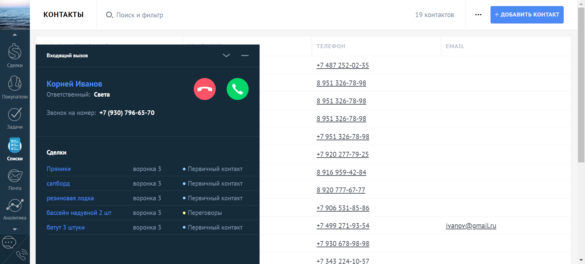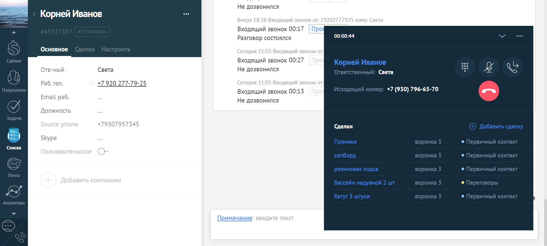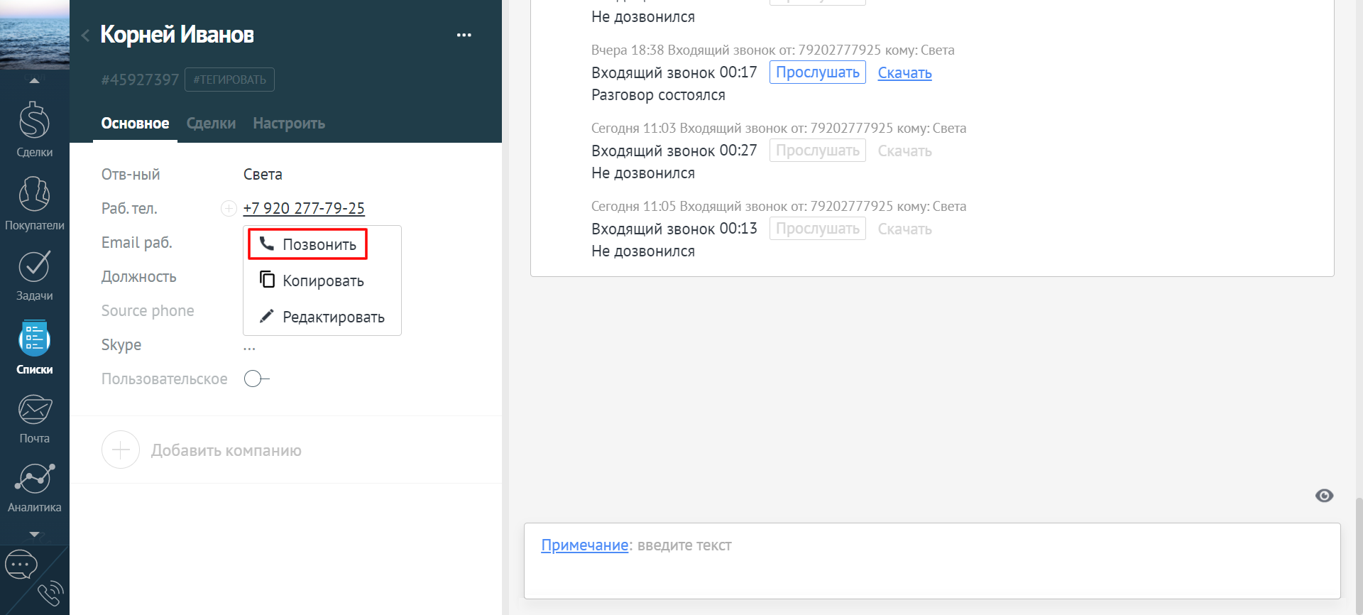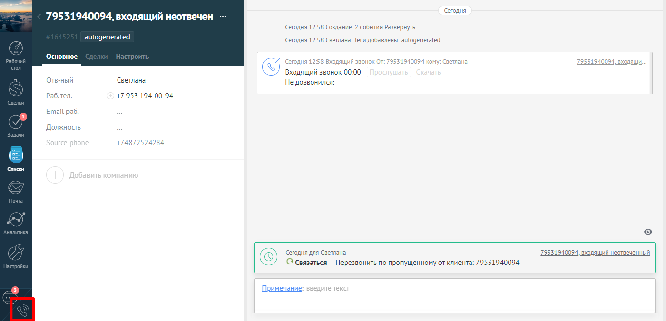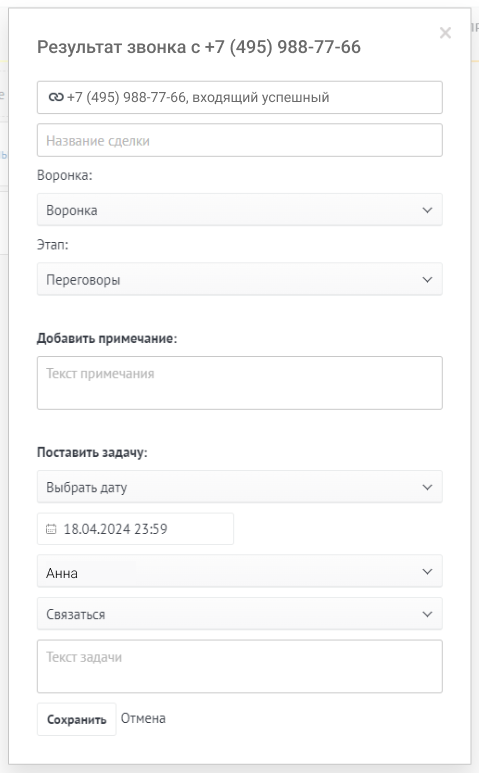 - создать новую сделку по результатам звонка (она будет связана с выбранным контактом),