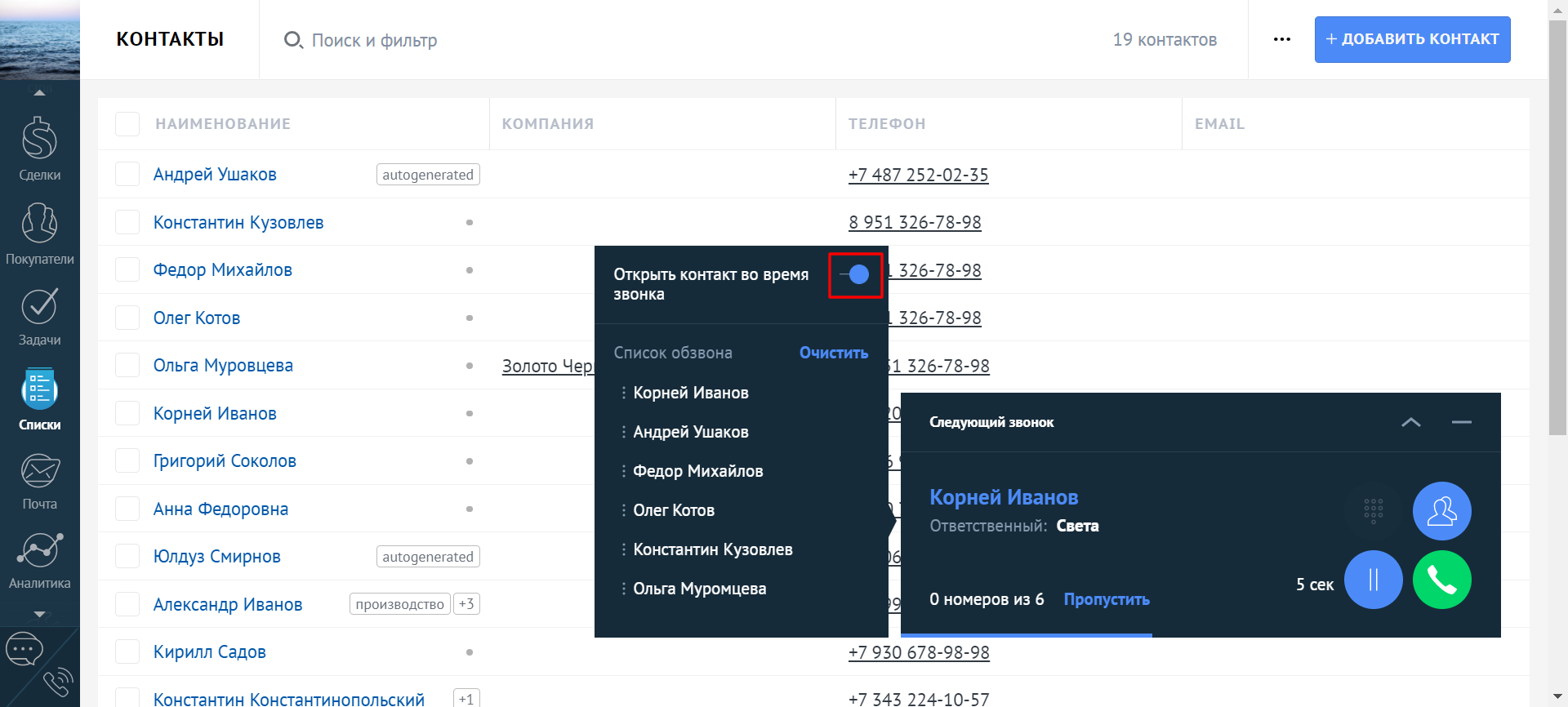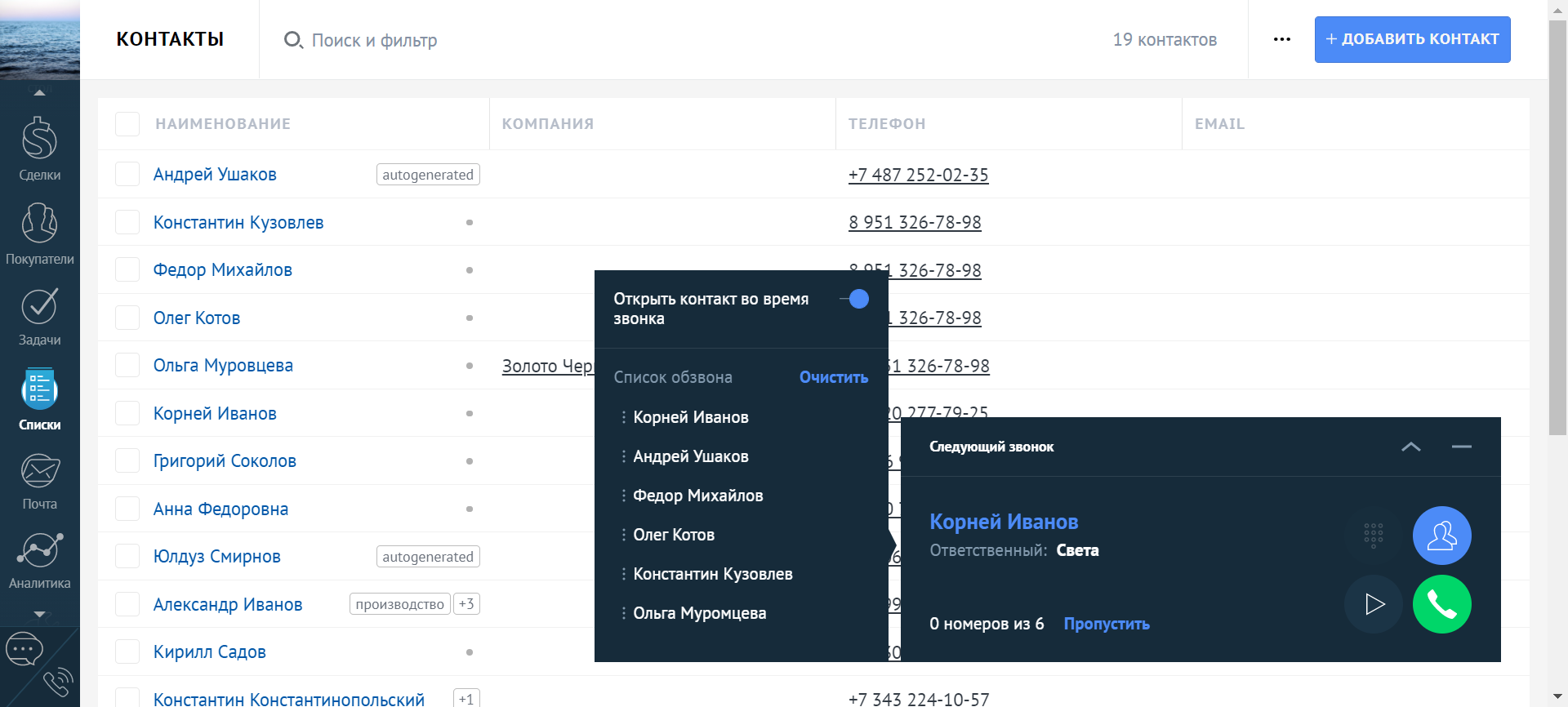 Если менеджеру необходимо позвонить большому количеству клиентов, он может сэкономить время, создав в amoCRM список контактов для обзвона и запустив его через виджет.