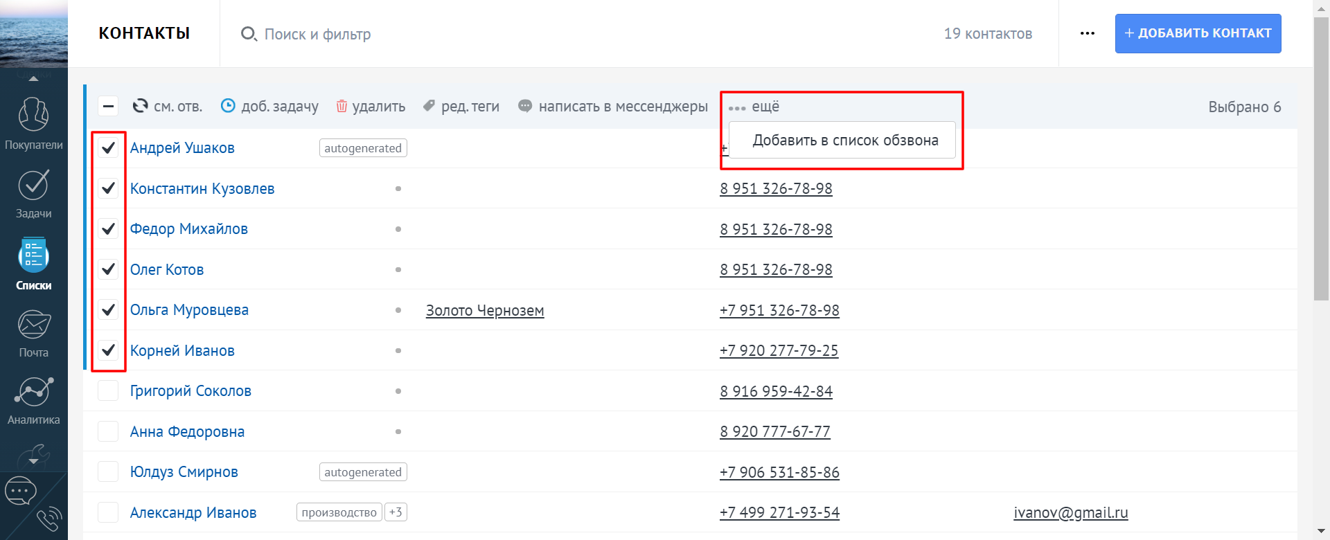 Чтобы создать список обзвона, в списке контактов выберите несколько имен, нажмите «Еще» и «Добавить в список обзвона».