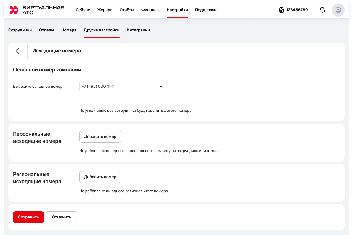 При звонках сотрудников из других АТС, добавленных в отделы вашей ВАТС, по умолчанию будет подставляться основной номер компании. Чтобы настроить подстановку региональных и персональных номеров, обратитесь в поддержку.Чтобы настроить логику подстановки номеров, перейдите в раздел «Настройки» → «Другие настройки» → «Исходящие номера».