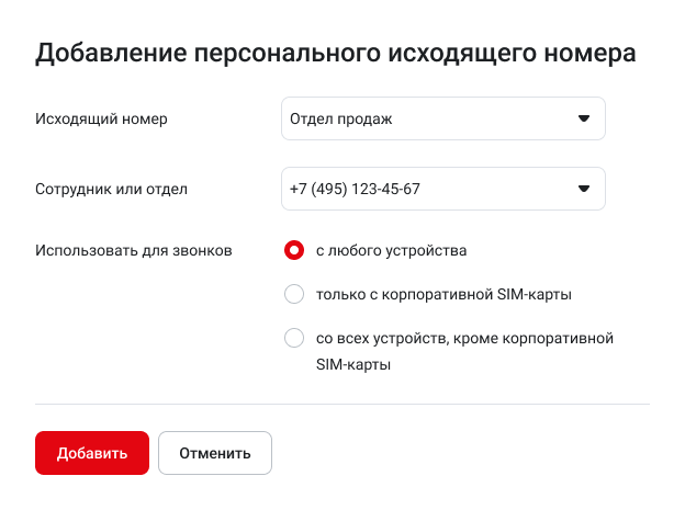 4. Выберите устройство при звонках с которого будет использоваться номер. Для сотрудника можно назначить несколько персональных исходящих номеров. В зависимости от устройства, с которого он совершает звонок, будет использоваться тот или иной номер.