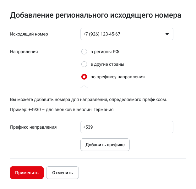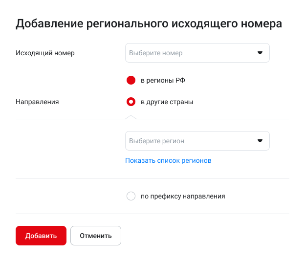 Если вы не нашли нужное направление звонков в списке регионов РФ и других стран, можете назначить исходящий номер по префиксу этого направления. Например, вы можете установить отдельный исходящий для звонков на локальные городские номера.