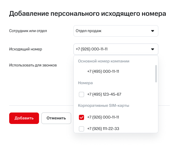 Назначьте сотрудникам и отделам номера, которые будут определяться при исходящих звонках.