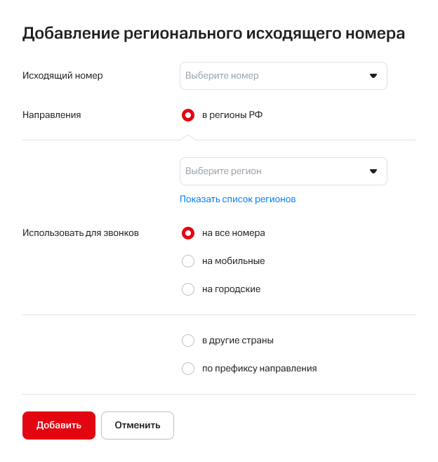 1. В блоке «Региональные исходящие номера» нажмите на кнопку «Добавить номер».