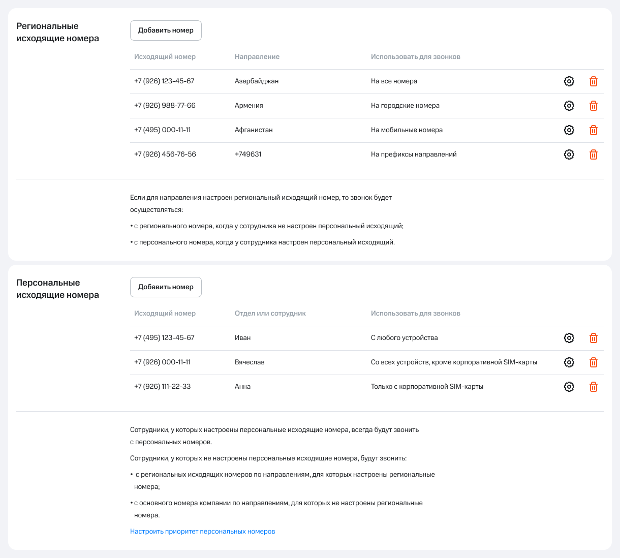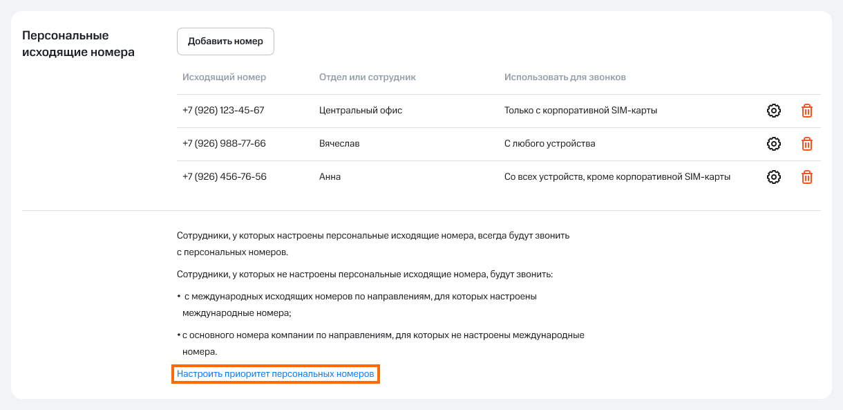 6. Назначьте персональные номера остальным сотрудникам. Проверьте, все ли корректно настроили. Если необходимо, отредактируйте настройки, нажав на шестеренку. Если хотите удалить этот номер из списка персональных, нажмите на корзину справа от номера.