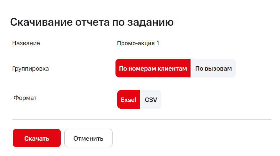В открывшемся окне выберите, каким образом группировать данные в отчете (по номерам клиентов или по вызовам), и формат загружаемого файла.
