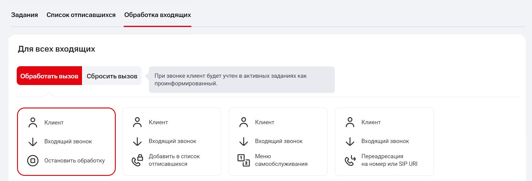В настройках автоинформирования перейдите на вкладку «Обработка входящих». По умолчанию ниже выбран сценарий «Обработать вызов». Это значит, что при входящем звонке АТС будет принять вызов и совершить одно из 4 действий: