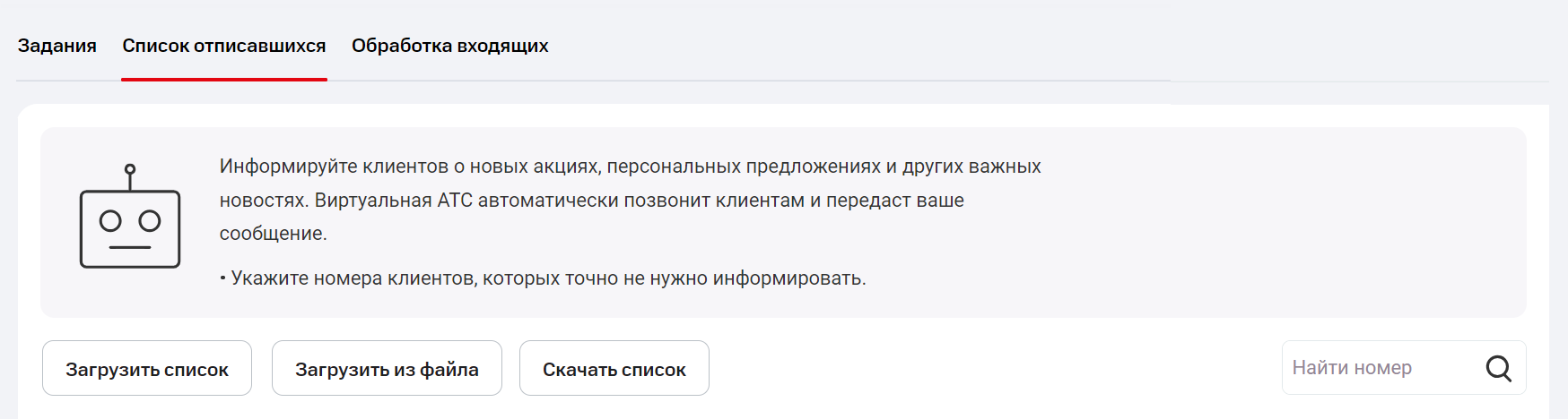 В список отписавшихся автоматически попадут клиенты, которые перезвонили на номер для автоинформирования и в голосовом меню выбрали пункт «Отписаться от аудиорассылок».