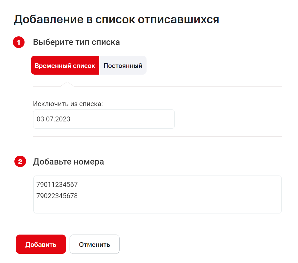 Выберите, как долго номера должны находиться в списке исключений (временно или постоянно), и введите один или несколько номеров в формате 7ХХХХХХХХХХ.