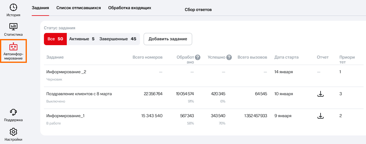 Готово! В установленную вами дату и время старта задание на автоинформирование запустится автоматически, а вы сможете проследить за выполнением задания на вкладке «Задания» – «Активные».