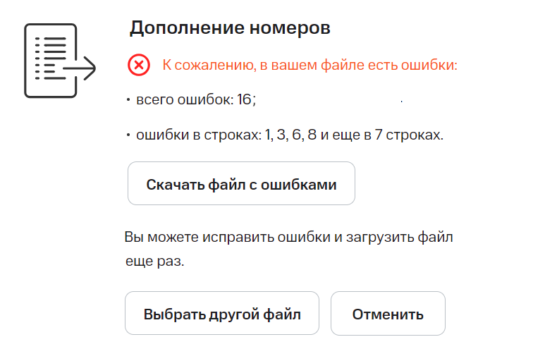 Если все номера клиентов соответствуют требуемому формату, вы увидите сообщение об успешном добавлении номеров. Если в одном или нескольких номерах были допущены ошибки, Виртуальная АТС предупредит вас об этом и укажет строки, содержащие номера неправильного формата.