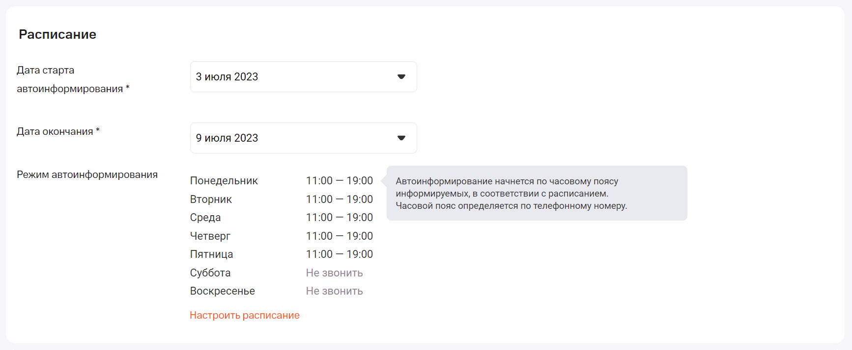 Автоинформирование начнется в указанное вами время, учитывая часовой пояс клиентов, который Виртуальная АТС определит по номеру телефона. Если Виртуальная АТС не сможет определить часовой пояс, автоинформирование по этому номеру осуществляться не будет.Как скачать отчет по автоинформированию