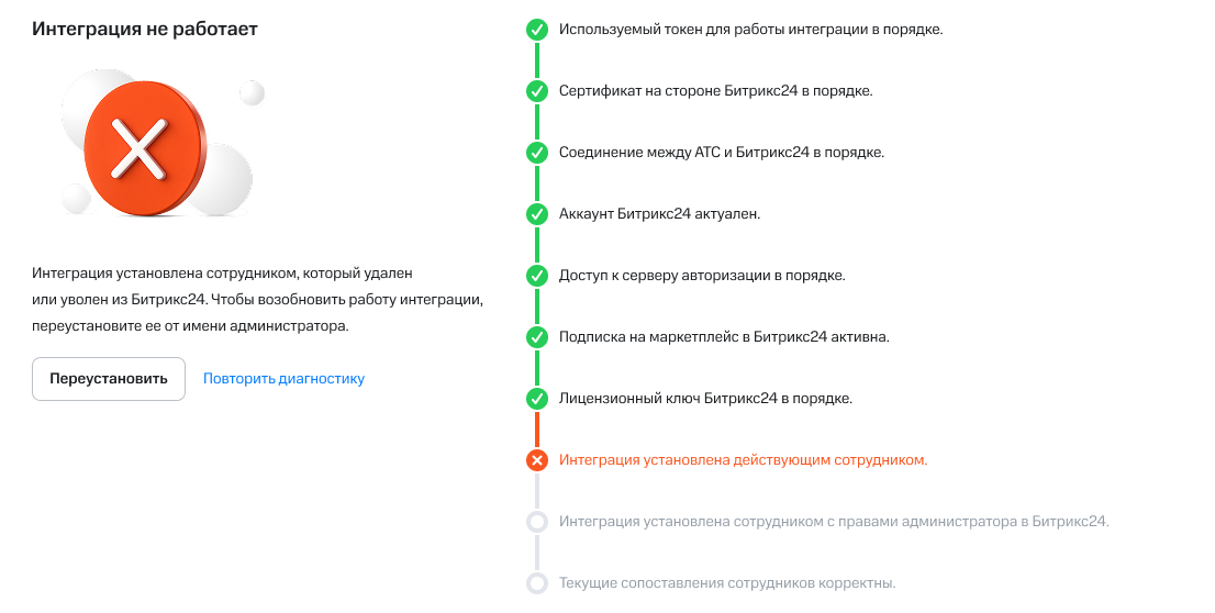 Когда интеграция с Битрикс24 работает со сбоями, это мешает бизнесу: теряются звонки, лиды и задачи. Панель диагностики автоматически находит проблемы, для выявления которых раньше требовалась долгая ручная проверка.
