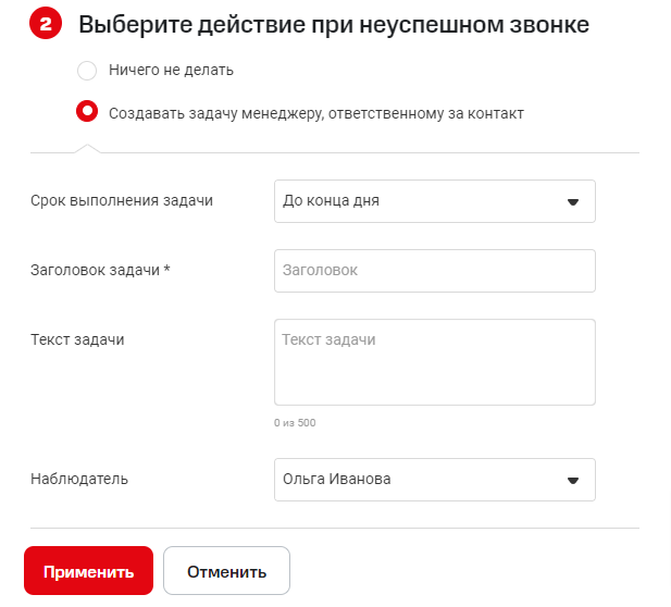Для этого вам нужно выбрать в настройках сценария ответственного за задачу и наблюдателя, который сможет контролировать ход и результат выполнения задачи (например, руководитель). Затем введите заголовок и в случае необходимости более подробно опишите задачу в поле «Текст задачи». Эти настройки могут быть разными для успешных и неуспешных звонков.