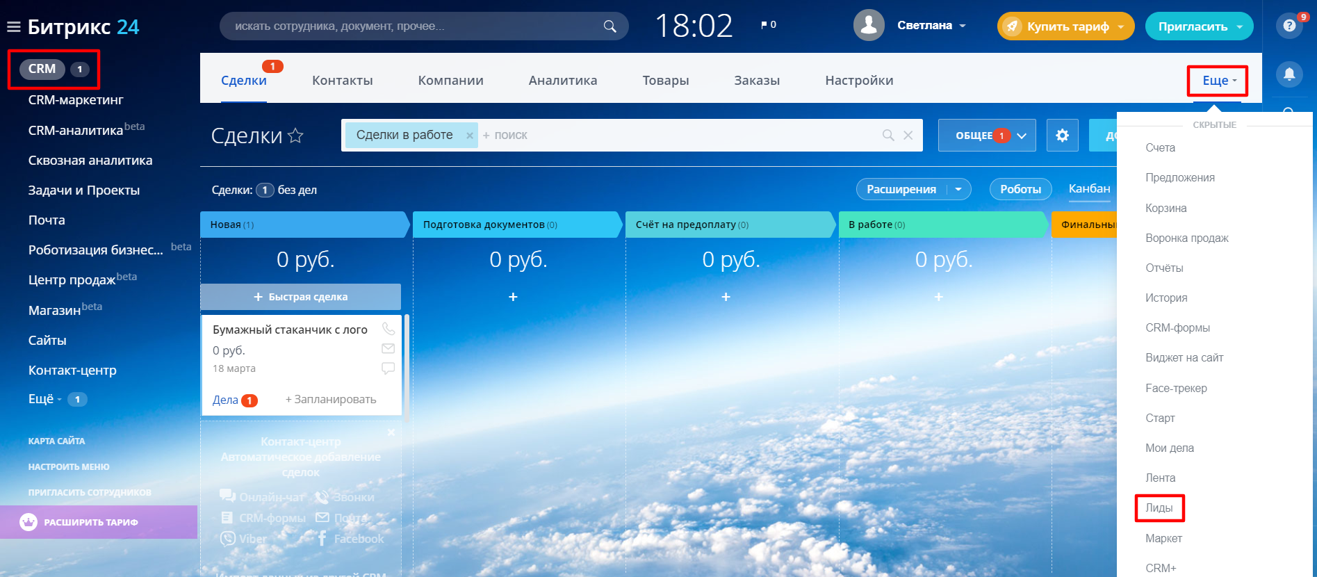 Чтобы выбрать режим, перейдите в настройки CRM, нажмите кнопку «Еще» и кликните по полю «Лиды».