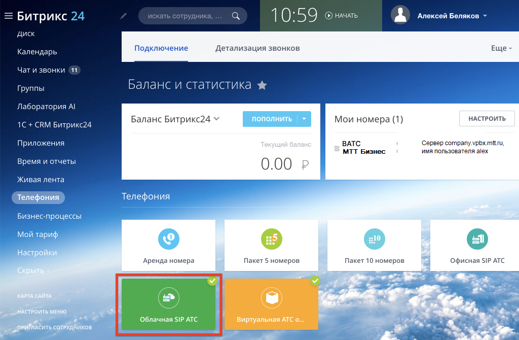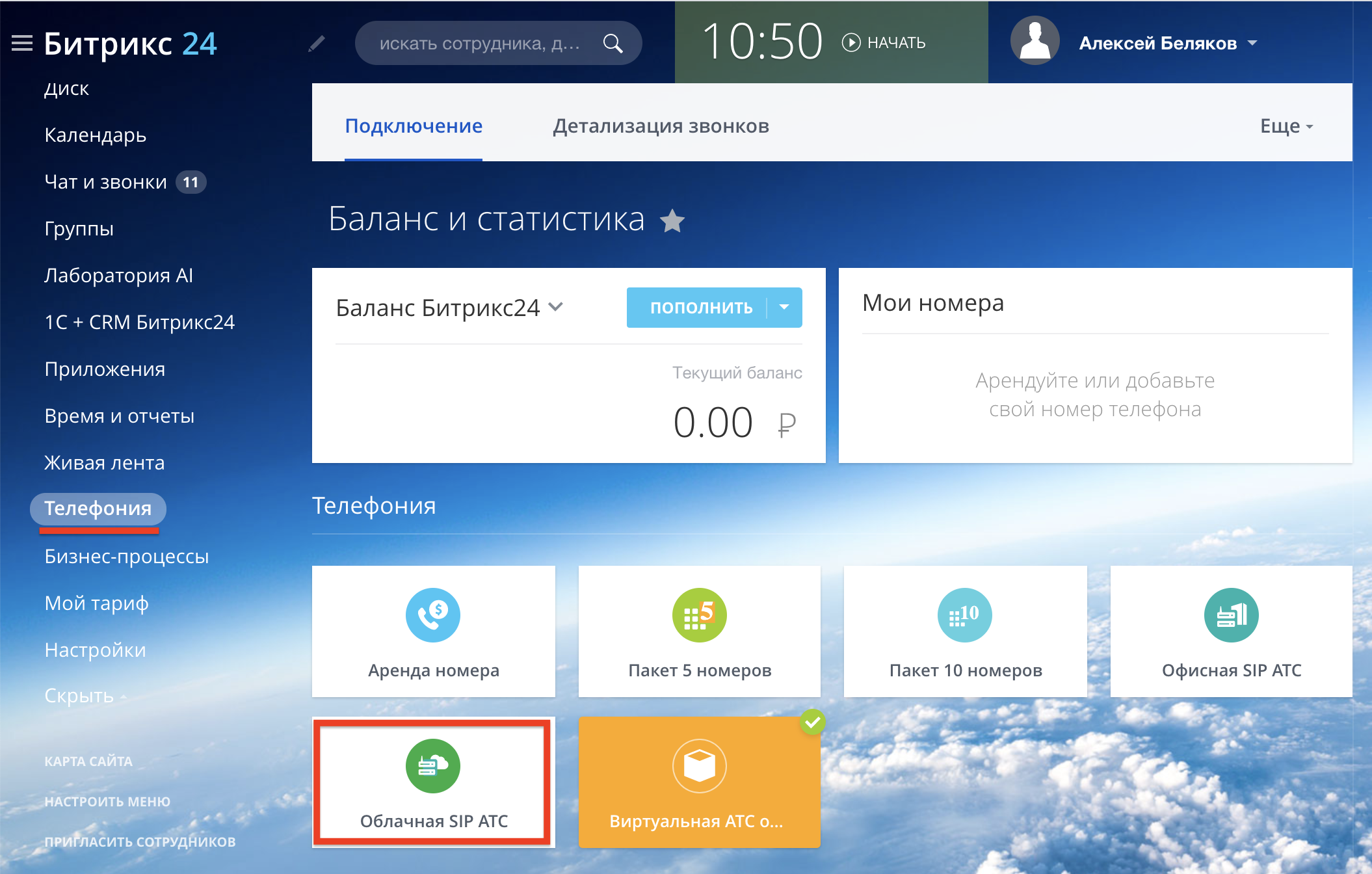Справа вверху нажмите «Подключить Облачную АТС»