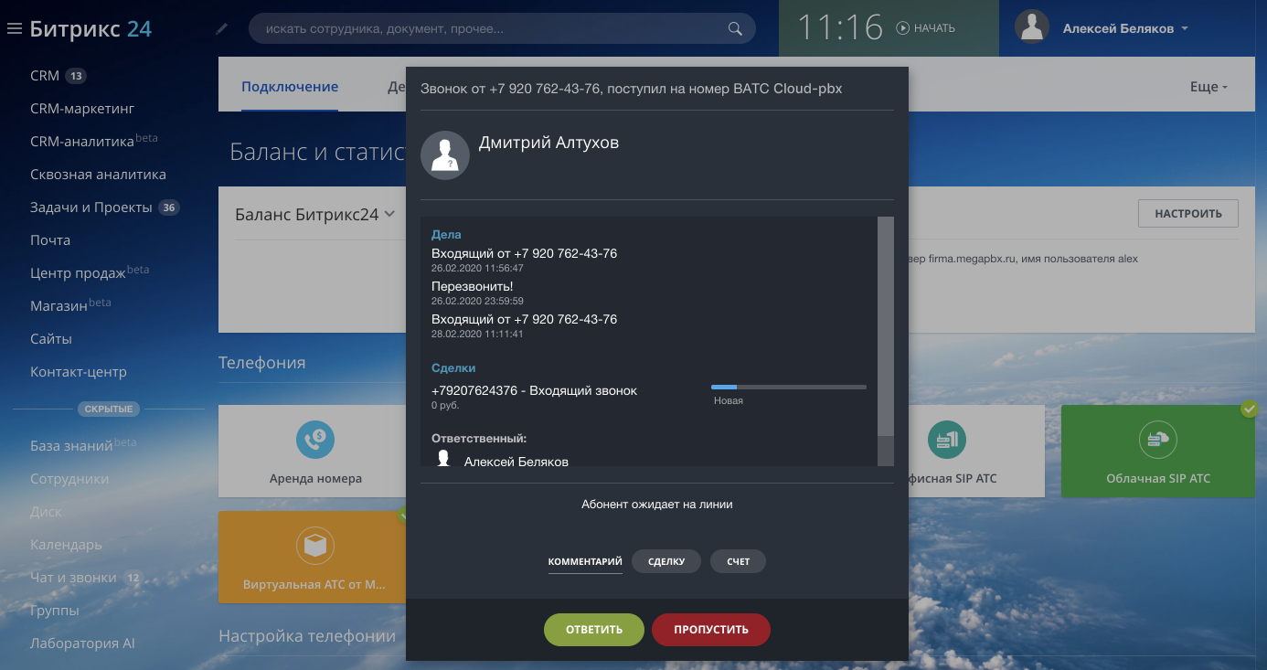 Теперь все вызовы на этого сотрудника будут поступать в интерфейс Битрикс24.