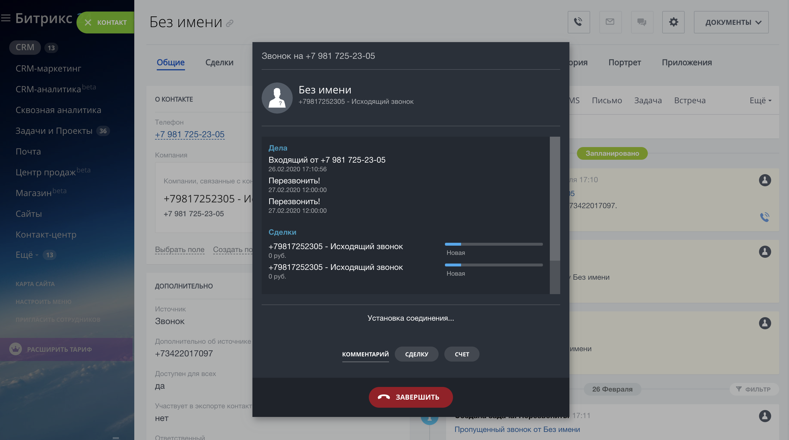 Для совершения исходящего вызова нужно нажать на номер телефона, во время вызова откроется окно