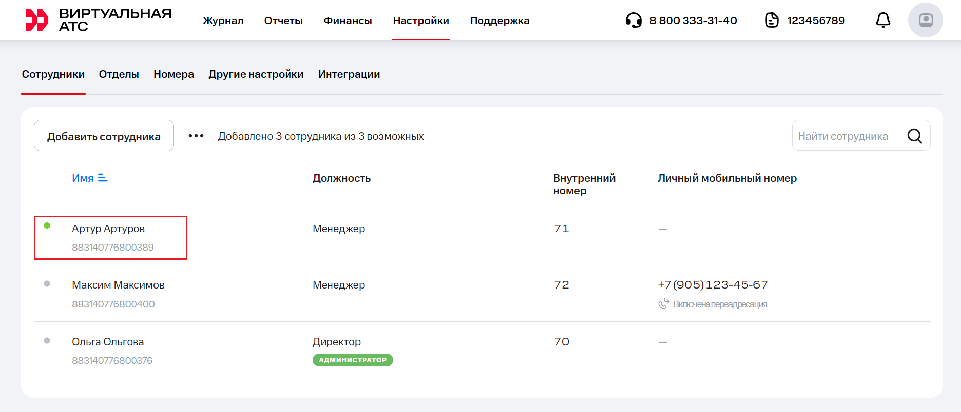 Нажмите «Сохранить». Если вы все настроили правильно, в разделе «Сотрудники» Виртуальной АТС напротив нужного сотрудника подсветится зеленая точка: