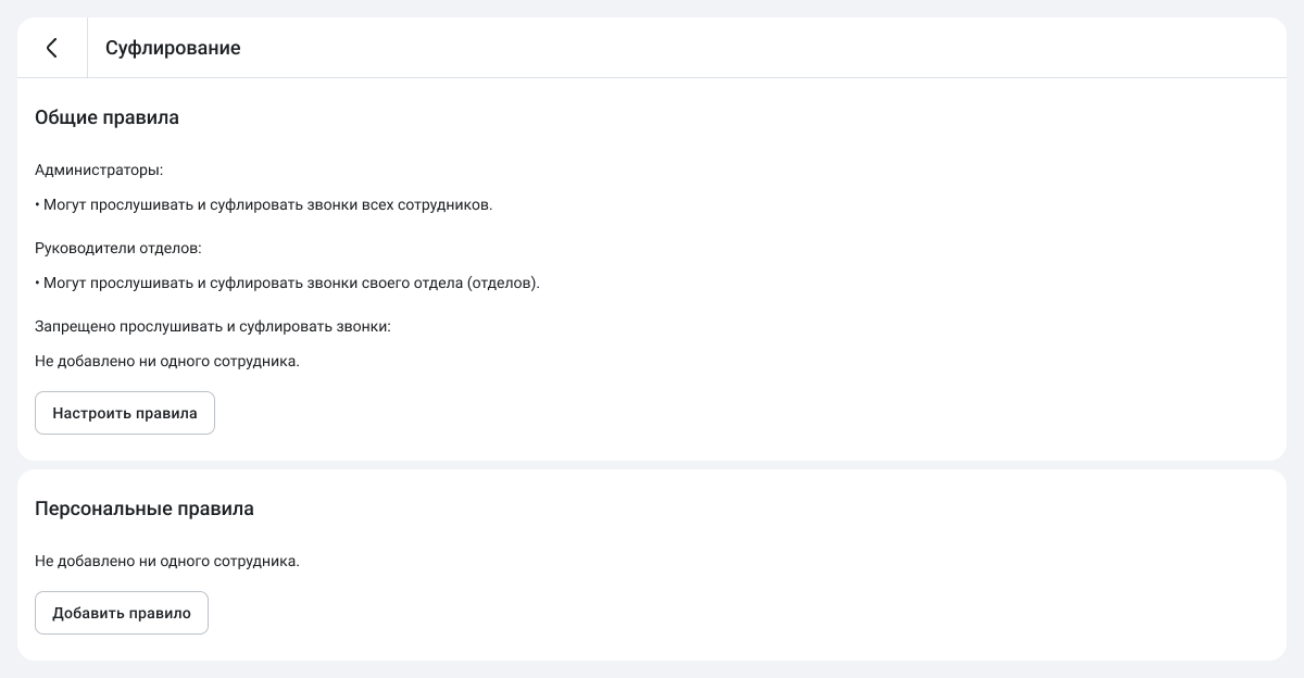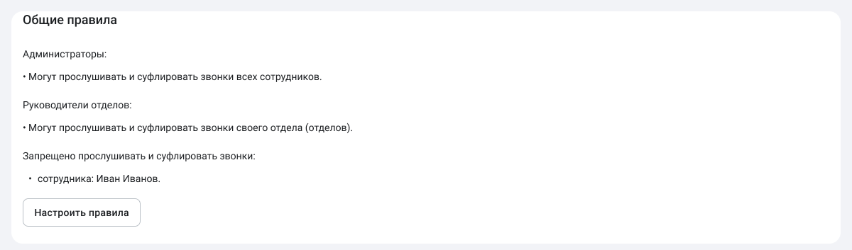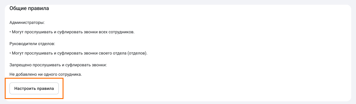 По умолчанию Администраторы могут прослушивать и суфлировать звонки всех сотрудников компании, а Руководители - только своего отдела. Чтобы администраторам и руководителям запретить прослушивать и суфлировать звонки, в блоке «Общие правила» нажмите «Настроить правила».