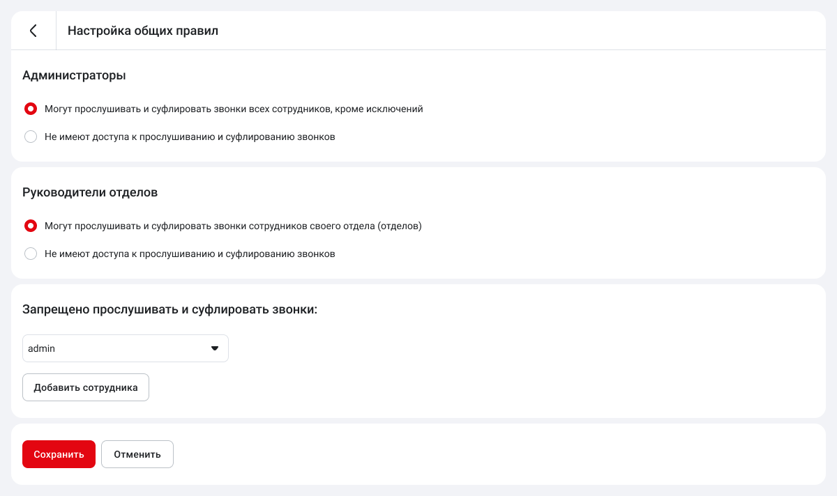 - В общих правилах настраивается доступ к прослушиванию и суфлированию звонков для администраторов и руководителей отделов, а также запрет на подключение к звонкам выбранных сотрудников.