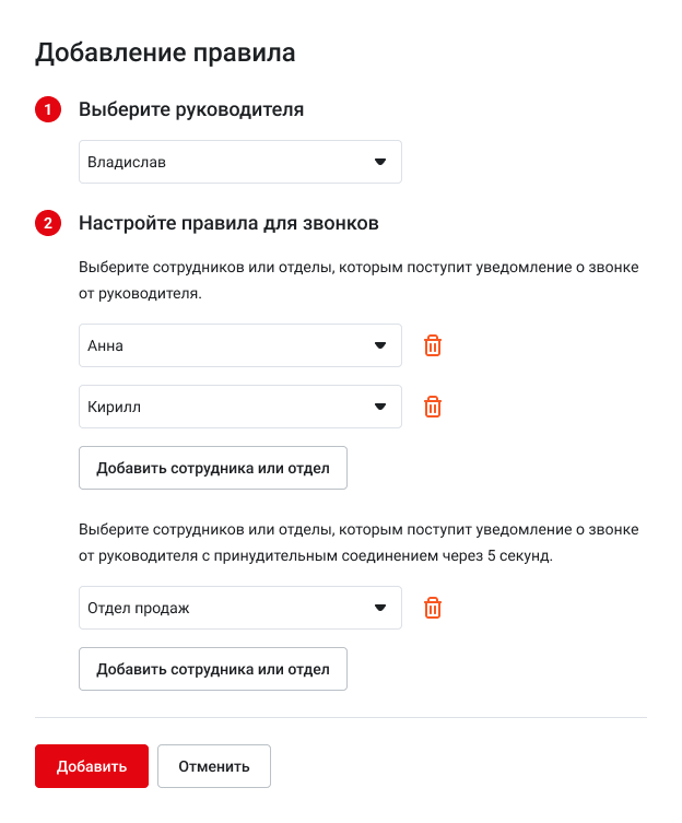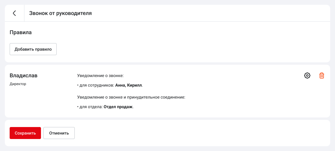 Готово! Теперь руководитель сможет в любой момент дозваниваться до выбранных в правило сотрудников и отделов.